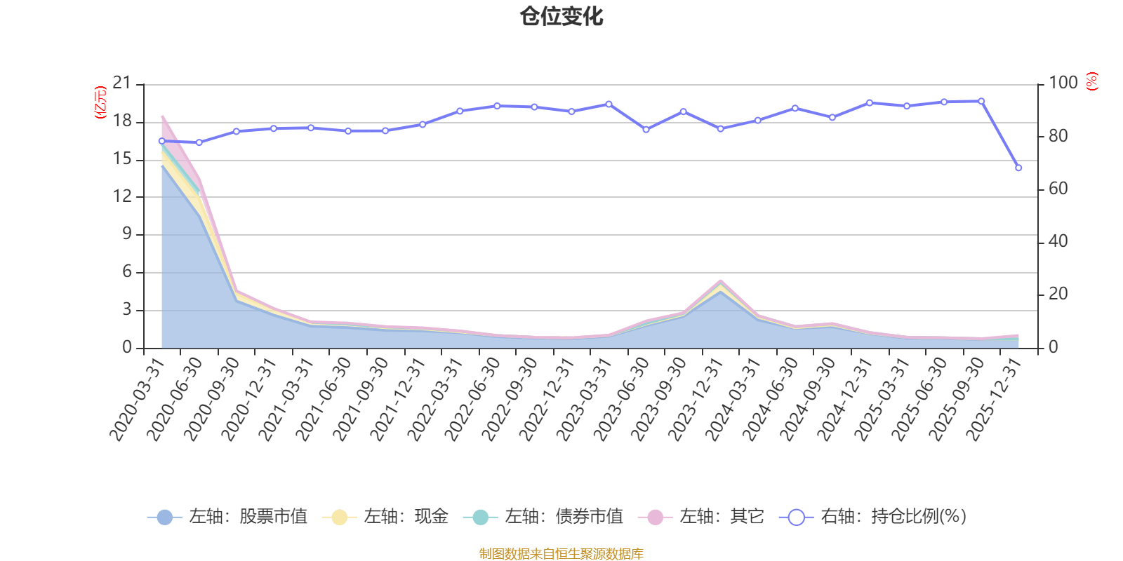 据定期报告数据统计,近三年平均股票仓位为87.7%,同类平均为88.34%。2025年三季度末基金达到93.55%的最高仓位,2025年末最低,为68.31%。